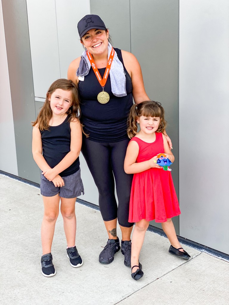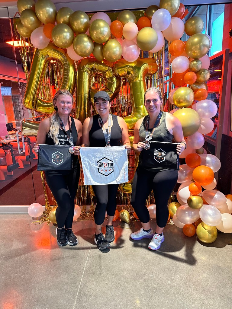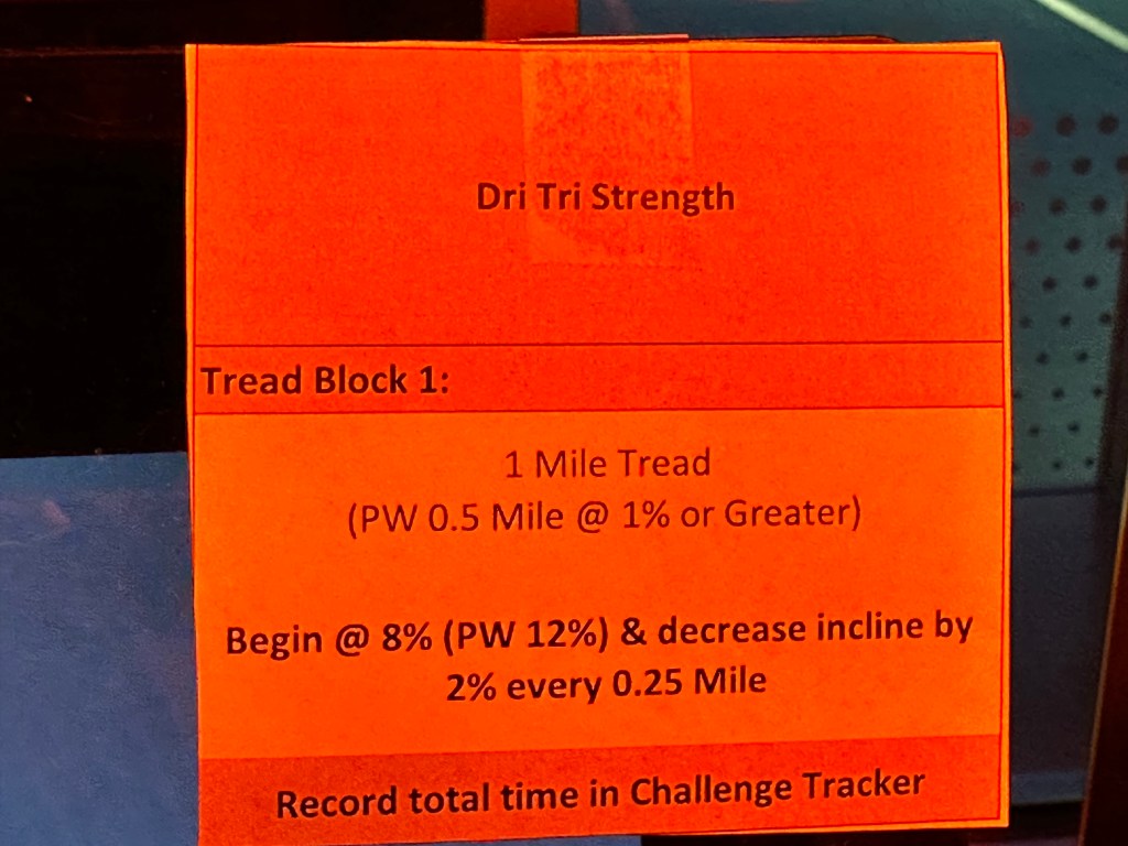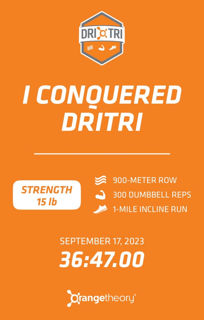 This year there was a new option. A strength option. I was super excited when they announced this just because I love lifting, I love a new challenge & I was ready for something new when it came to the Dri Tri! The strength option was 900 meter row, 300 dumbbell reps, 1 mile run at an incline. You started on the rower did 300 meters then went to the floor and did 3 rounds of each exercise 10 times. Back to the rower, 2 more rounds of exercises — back to rower & then 1 round of exercises. After that you are up to the tread — start at 8% and go down by 2% every .25 of a mile. Whew.