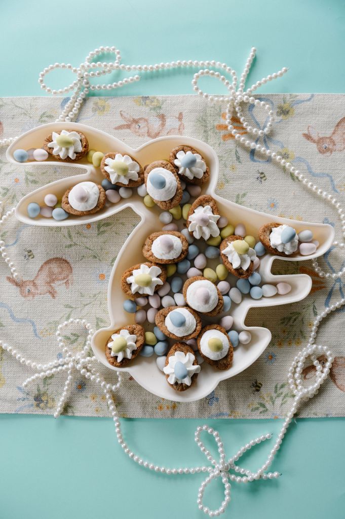 Pearl Garland- @homegoods, Runner- @homegoods, Bunny platter- Target a few years ago, candy eggs are Cadbury eggs.